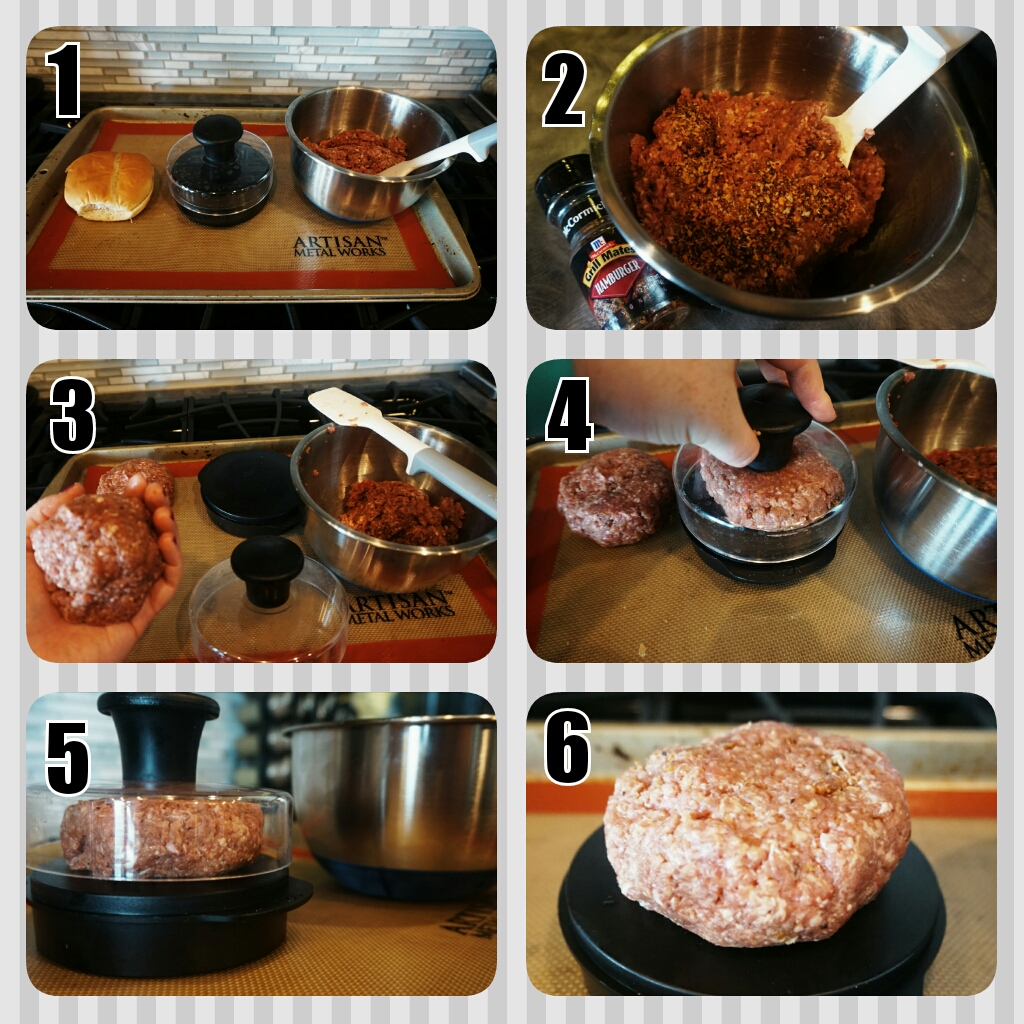 Slowly press ball into patty shape, using the bun as a reference to ensure the patty and bun will fit together. This time I made them the same size, but normally I make them a little larger than the bun because the meat will shrink once on the grill. If you do not have a press (I got mine for $5 at Lowes) using the palms of your hands will do the trick, just make sure not to use your fingertips because then the meat will not be distributed evenly.