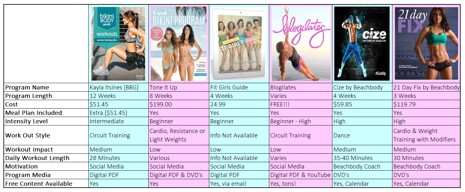 With so many new at-home workout programs, it can be hard to decide which one is right for you. As a new comer to the non-sedentary life style, I started off slow with five 30 day challenges to kick start my fitness journey. I am almost finished with these challenges and decided that I want to be apart of a workout program that has some structure when I finish. I follow a lot of active living Instagram accounts and most of them have their own programs, so I decided to do an actual comparison of the most popular at-home workout programs. All six programs I will be comparing have received rave reviews via social media, which is why I have decided that that the comparisons will only be factual. Getting this factual data was no easy task for some of these programs, and as you can see from the chart, in some instances, I was not able to find data. After the comparison, I will have people that have actually used each program give their review.